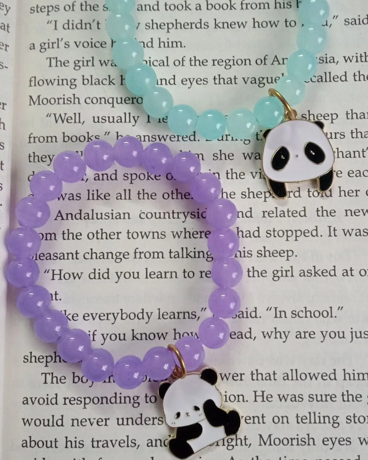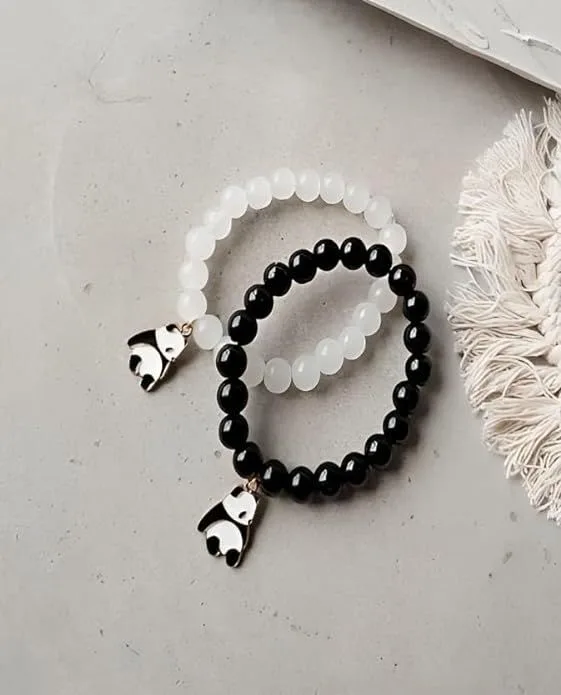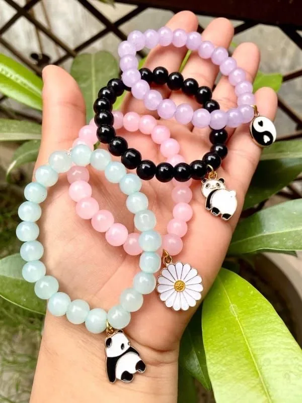 This playful stretch bracelet features a delightful mix of glossy and faceted beads in pastel and vibrant tones — from soft pinks and greens to bright fuchsia. At the center, a charming gold-outlined panda charm steals the show, holding a tiny gold chain with a dangling mint-green bead for added whimsy and movement.