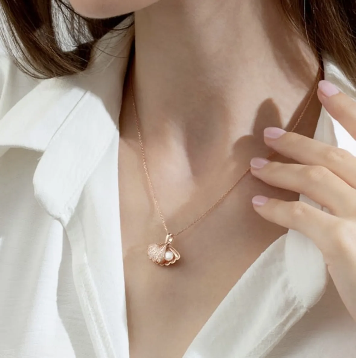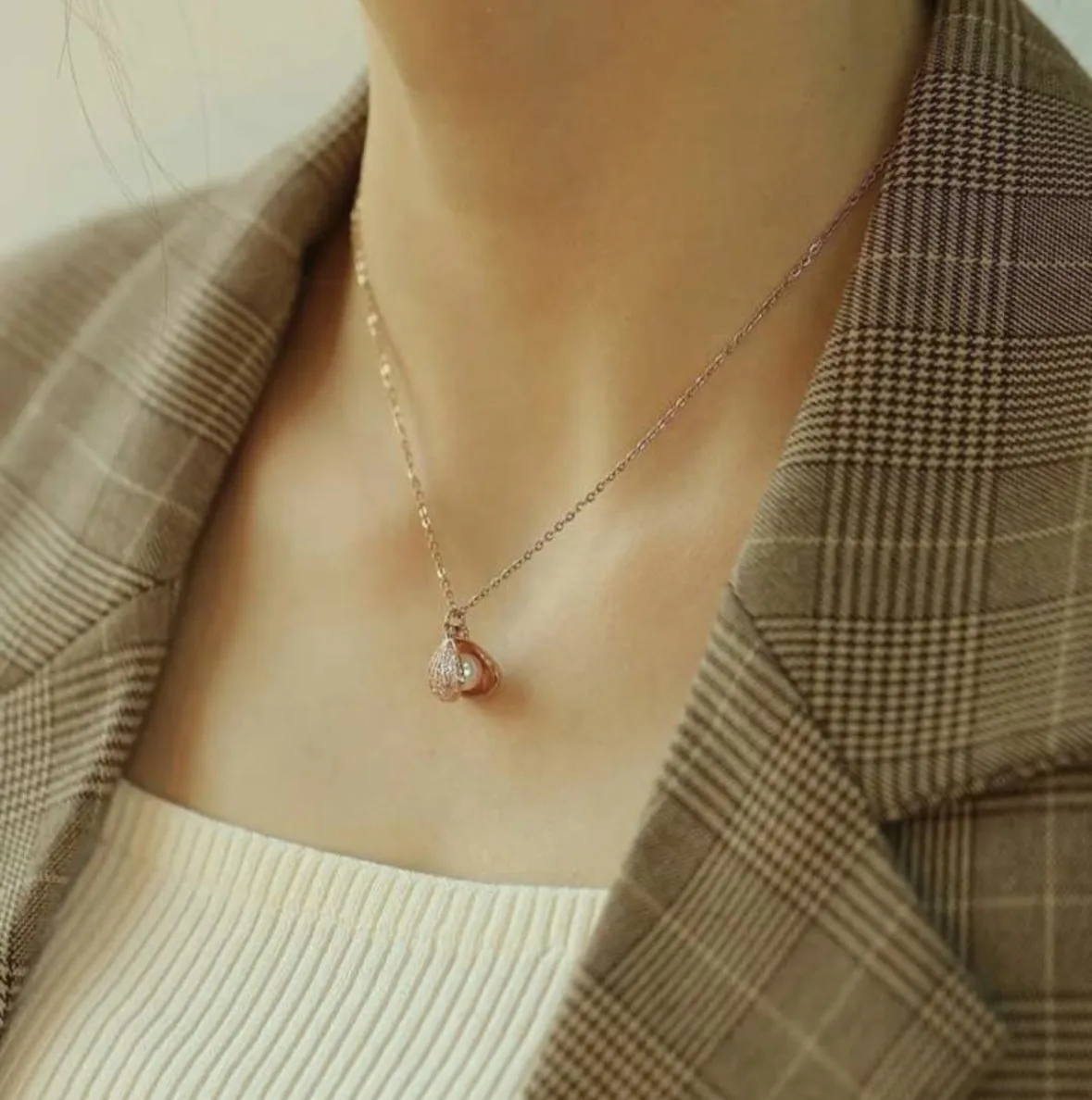 Embrace the elegance of the sea with our Rose Gold Pearl Shell Necklace, a stunning piece inspired by ocean treasures. This delicate necklace features a beautifully crafted shell pendant in luxurious rose gold, embellished with shimmering cubic zirconia for a touch of sparkle. Nestled inside the open shell design is a luminous faux pearl, adding a graceful and timeless charm.